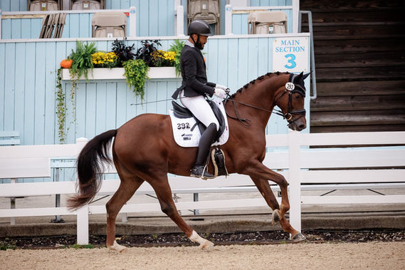 Fabienne completed her Hanoverian Mare Performance Test in 2023 with top scores for gaits under the rider: 9 for trot, 8.5 for walk, and 8 for canter. With a final score of 7.67, she now becomes a Hanoverian Premium Mare Candidate! She also placed 3rd in a competitive 4-Year-Old and Older Mares Under class at Dressage at Devon this Fall, only her second time out. With her top riding horse qualities of high rideability and very good gaits, we look forward to her becoming a part of our breeding program.