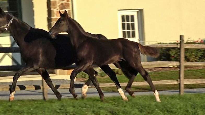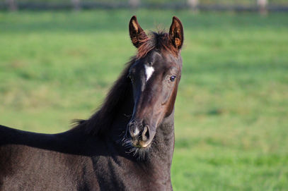 A super attractive colt sired by the successful FEI stallion Cum Laude and out of the Special Premium and Elite Stute Rhosemary, by Rosentanz. Tall, long-lined, with unlimited expression and a solid foundation. Top cadence, good ground cover, and wonderful lift and scope especially through the front end.